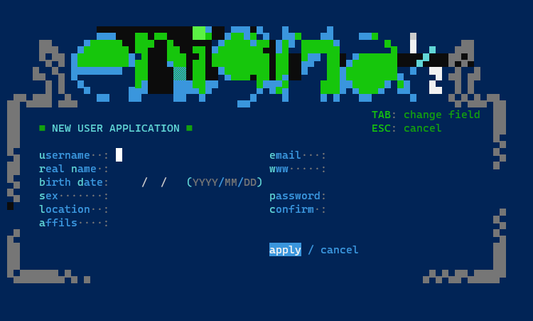 Although it is recommended to use a BBS compatible shell, my windows terminal worked fine, and telnet revealed this cool landing page that gives the option to login or create an account by applying to sysops !